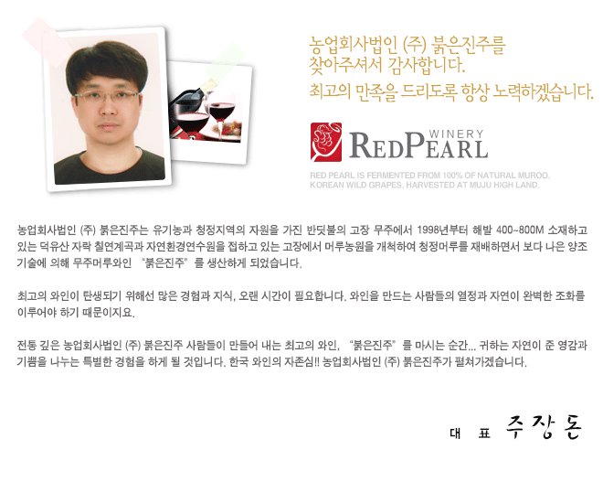 ȣ : ȸ () | ǥ : 嵷 | ڹȣ : 418-81-47700 ֱ ȼ 482 | Tel (063)323-3366 | Fax (063)323-3367 E-mail : redpearl3366@hanmail.net COPYRIGHT(C)2005-2009 mujuwine.co.kr ALL RIGHTS RERVED.